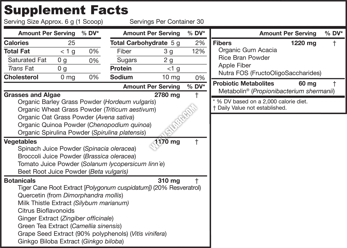 Треви и водорасли, органичен сок от ечемичена трева, органичнакиноа, органична спирулина, , органичен сок от пшенична трева, органичен прах от овес, спанак на прах, броколи на прах, домати на прах, цвекло на прах, ботанически ресвератрол, кверцетин, екстракт от бял трън, цитрусови биофлавоноиди, екстракт от джинджифил, екстракт от зелен чай, екстракт от гроздово семе, екстракт от гинкго билоба, органични фибри, акациева смола, Nutra FOS, оризови трици, ябълкови фибри, пробиотични метаболити.