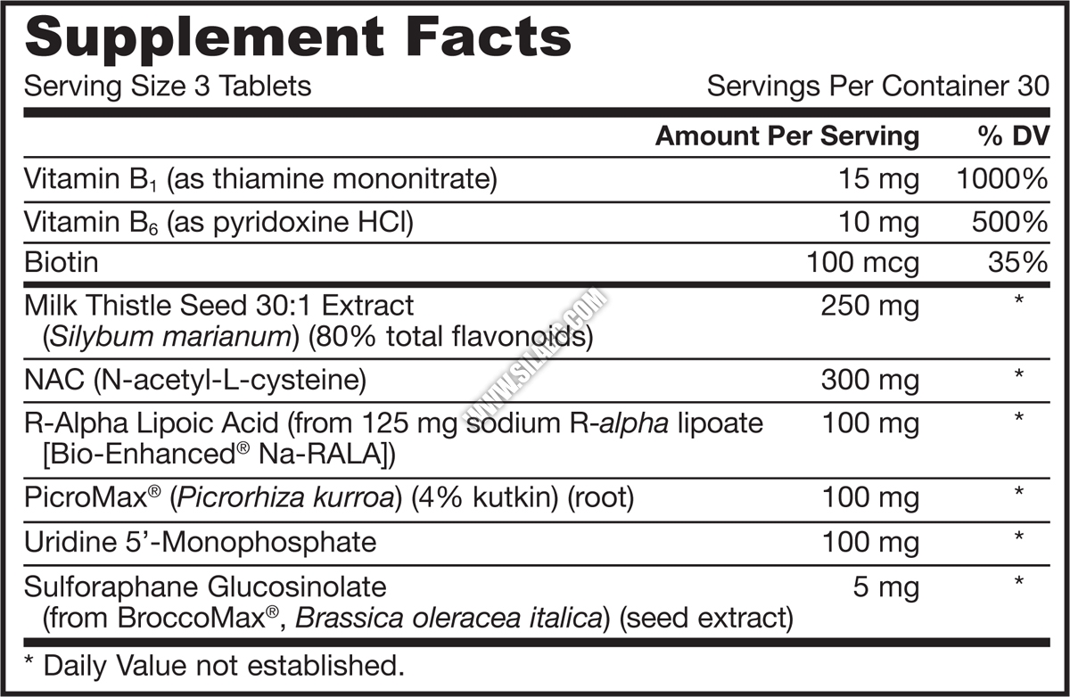 екстракт от бял трън, ацетилцистеин и алфалипоева киселина, екстракт от пикороза куроа, уридин-5-монофосфат, вит. В комплекс, целулоза, магнезиев стеарат (растителна основа), калциев фосфат, стеаратна киселина (растителна основа), силиконов диоксид, малтодекстрин.