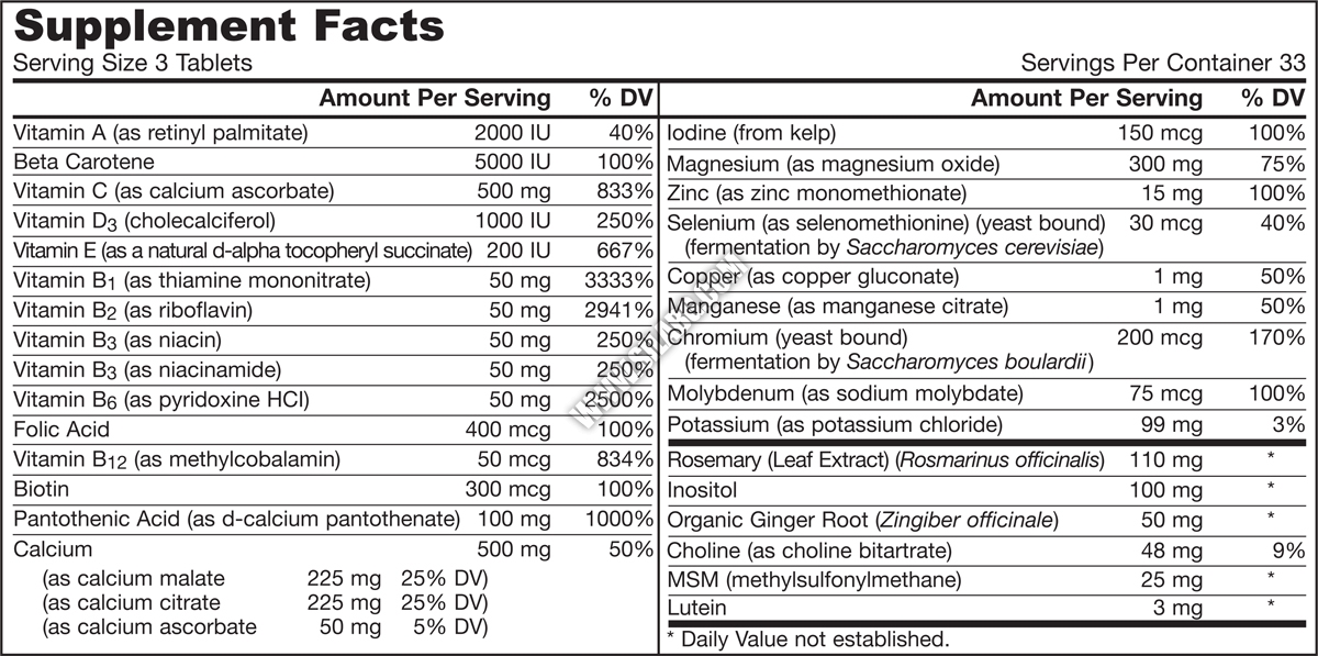 Jarrow Formulas съдържа вит. А, В-комплекс, вит. С и Е, които набавят на организма нужните му количества. Те са обогатени от три форми на калция, малатна, цитратна и карбонатна за възможно най-добра биоусвоимост. Високото съдържание на витамини спомага за протичането на различни процеси на клетъчно ниво като имат благоприятно действие върху сърдечносъдовата система, черния дроб и очите.