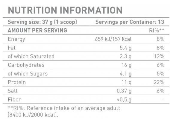 Съставки: овесено брашно (без глутен), суроватъчен протеин концентрат от мляко (съдържащ лактоглобулин, лактоферин, лакталбумин и имуноглобин), суроватка на прах (мляко), малтодекстрин, яйчен протеин, мицеларен казеин (мляко), Кисело мляко на прах (мляко), пълнител (натриев бикарбонат), овкусител (натриев хлорид), Подсладител (сукралоза).