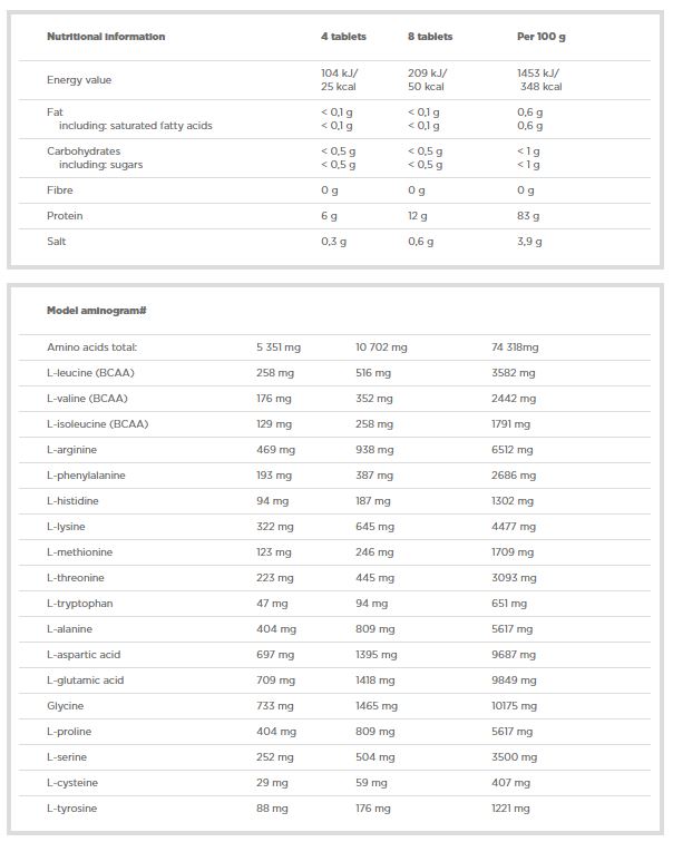 Съставки:90% хидролиза на протеини Северноатлантическа сьомга (ProGo ™), пълнител вещество - калциев карбонат, поливинилов алкохол (PVA), полиетилен гликол, талк; противослепващи агенти - силициев диоксид, магнезиев соли на мастни киселини; естествен аромат.