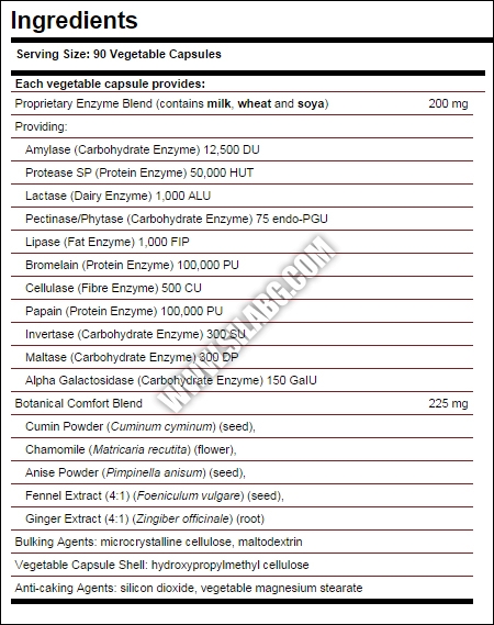 амилаза, протеаза, лактаза, пектиназа, липаза, бромелаин, целулаза, папаин, инвертаза, малтаза, алфа галактозидаза, кимион, копър, лайка, джинджифил, анасон