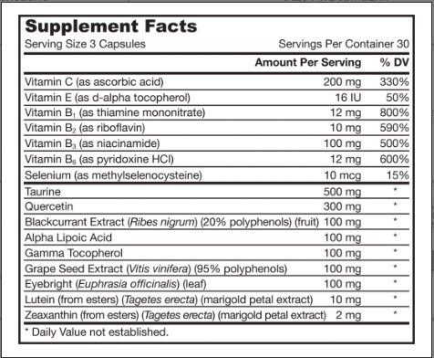 Съставки: Витамини С, Е, В1, В2, В3, В6, Селен, Таурин, Кверцетин, екстракт от касис, ALA,гама токоферол, екстракт от гроздови семки, екстракт от очанка, лутеин, зеаксантин.