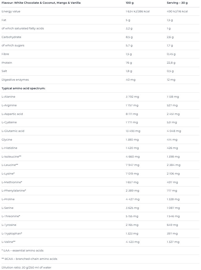 Съставки:Концентрат на суроватъчен протеин (съдържа слънчогледов лецитин и антислепващ агент калциев фосфат), суроватъчен протеин изолат (съдържа соев лецитин ), пшенично влакно (не съдържа глутен), стабилизатори: акация и ксантанова смола , противослепващ агент: силициев диоксид, натриев хлорид, подсладители: сукралоза и стевиол гликозиди, оцветител: бета-каротин.