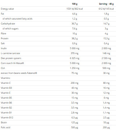 Съставки:Малтодекстрин, соев протеинов изолат, свински желатинов хидролизат, млеченпротеин изолат , бамбукови влакна, инулин, царевично нишесте Hi-Maize®, рибено масло,ароматизатор, соев лецитин , L-карнитин тартарат, концентрат от цвекло, стабилизатори отакация и ксантанова смола, екстракт от морски водорасли и гроздови семена - ID-aIG ™,витамин премикс: L-аскорбинова киселина, DL-a-токоферол ацетат, никотинамид, калциев Dпантотенат,пиридоксинхидрохлорид,рибoфлавин, тиамин мононитрат,птероилмоноглутаминова киселина, D-биотин, цианокобаламин,подсладители:сукралоза истевиол-гликозиди, хром лактат, витамин К2, холекалциферол.