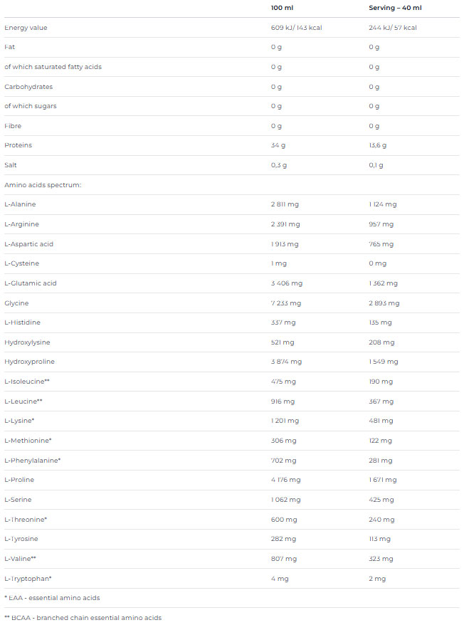 Съставки: вода, говежди хидролизат, казеинов хидролизат, L-аргинин хидрохлорид, L-орнитин хидрохлорид, регулатор: лимонена киселина, тропична емулсия, подсладители: ацесулфам К и сукралоза , консерванти: сорбинова киселина и натриев бензоат, емулгатор: моно- и диглицериди на мастни киселини.