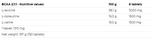 Съставки:L-левцин, L-изолевцин, L-валин, микрокристална целулоза за обемно вещество, антислепващ агент: магнезиев стеарат, клетъчно омрежена целулозна смола.