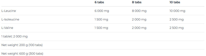 Съставки:L-левцин, L-изолевцин, L-валин, микрокристална целулоза, малтодекстрин и хидроксипропил метилцелулоза, противослепващ агент:магнезиев стеарат.