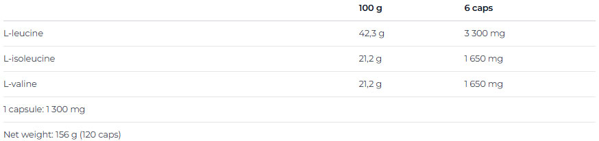 Съставки:L-левцин, L-изолевцин, L-валин, желатинова капсула (желатин, оцветител: титанов диоксид), пълнител: магнезиев стеарат, противослепващ агент: силиконов диоксид.