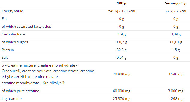 Съставки:Смес от 6 креатина (креатин монохидрат - Creapure®, креатин пируват, креатин цитрат, креатин етилов естер HCl, трикреатин малат, креатин монохидрат - Kre-Alkalyn®), L-глутамин, ароматизатор, силициев диоксид.
