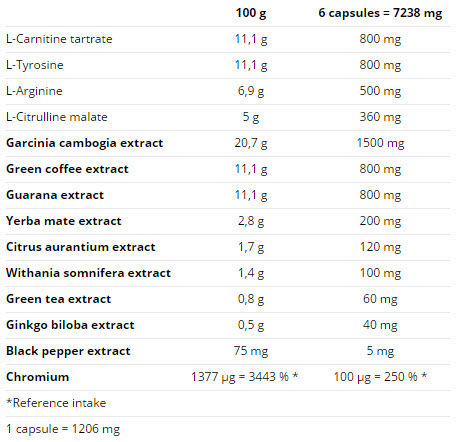 Съставки: L-Carnitine tartrate, L-Tyrosine, L-Arginine, L-Citrulline malate, Garcinia cambogia extract, Green coffee extract, Guarana extract, Yerba mate extract, Citrus aurantium extract, Withania somnifera extract, Green tea extract