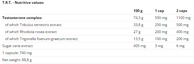Най-силната комбинация на съставки за ефективно повишаване нивата на тестостерон. T.R.T. съдържа три синергично действащи стандартизирани екстракта от Трибулус Терестрис, Родиола Розеа и Тригонела – които поддържат и стимулират растежа на мускулна маса.