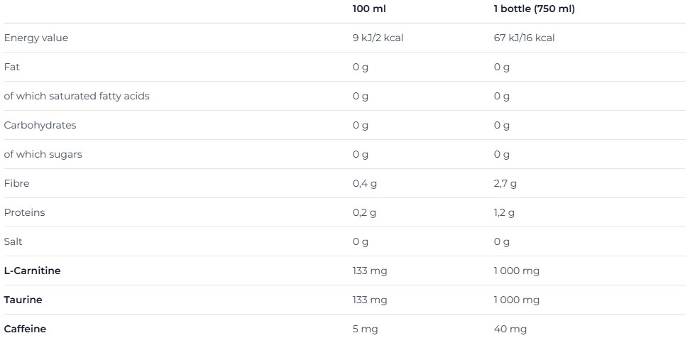 Съставки:Вода, стабилизатор полидекстроза, лимонена киселина, L-карнитин, таурин, аромат, калиев сорбат, натриев бензоат, подсладители (ацесулфам К, сукралоза), витамин В3.