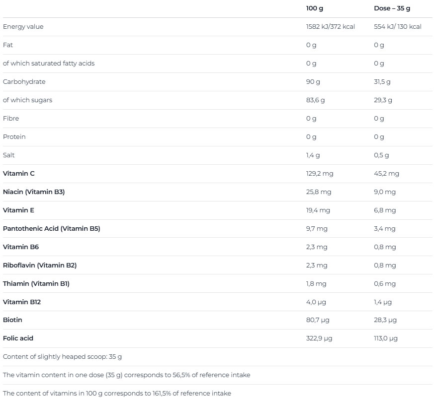 Изотонична напитка – 35 g (мерителна лъжица с лек връх) в 500 ml трапезна вода. Пийте по време на тренировки до 60 минути.