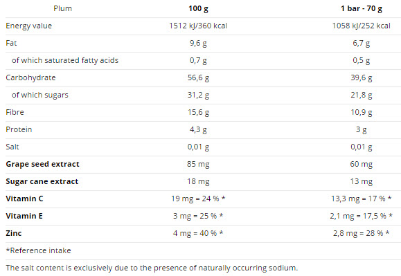 Съставки:Плодове 37,6%, оризово брашно, лешници 13,5%, фрукто-олигозахарид сироп - Actilight®, глюкоза-фруктозен сироп, (проантоцианидини 95%), цинков глюконат, витамин С, екстракт от захарна тръстика (минимум 90%), глюкоза (картофено нишесте, зехтин) поликозаноли, витамин Е.