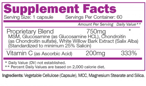 Съставки : MSM , Глюкозамин , Хондроитин , Витамин C ,кора от бяла върба
