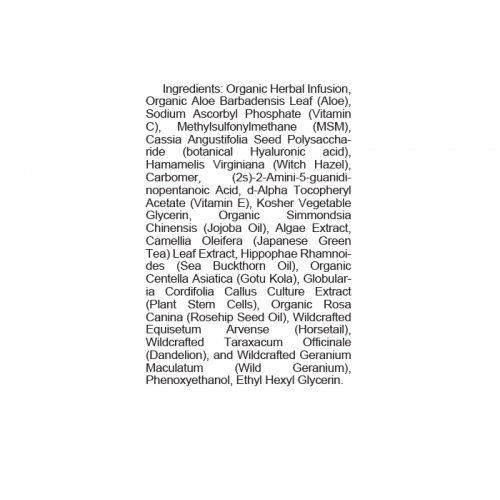 Съставки: Organic Herbal Infusion, Organic Aloe Baibadensis Leaf, Sodium Ascorbyl Phosphate, Methylsulfonylmethane, Cassia Angustifolia Seed Polysaccharide, Hemarnelis Virfiniana, Carborner, 2s-2-Amini-5-gianidi-nopentanoic Acid, d-Alpha Tocopheryl Acetate, Kosher Vegatable Glycenn, Organic Simmondsia Chinensis, Algae Extract, Camellia Oleifera Leaf Extract, Hippophae Rhamnoi-des, Organic Centella, Asiatica, Globular-ia Cordifolia Callus, Calture Extract, Organic Rosa Canina, Wildcrafted Equiseturn Avense, Wildcrafted Taraxacum Officinale, and Wildcrafted Geranium Maculaturn, Phenoxyethanol, Ethyl Hexyl Glycerin