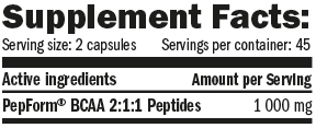 Съставки: ВСАА пептиди(пептиди смлечен произход, левцин, изолевцин, валин), желатин, магнезиев стеарат
