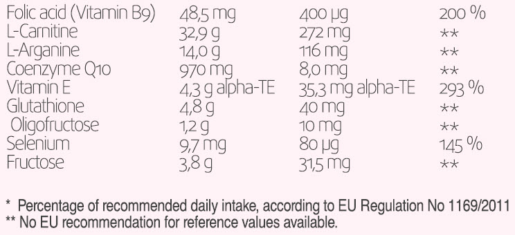 Съставки: Фолиева киселина, коензим Q10, глутатион, витамин Е, аргинин, олифруктоза
