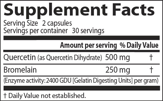 Кверцетинът, от своя страна, е биофлавоноид, извлечен от семената на растението Dimorphandra molis, чието основно действие се свързва с укрепване на структурата на клетъчните мембрани. Също така, употребата на кверцетин се свързва с противовъзпалителен и антиалергичен ефект, както и с поддържане на нормалната функция на белите дробове. Този биофлавоноид оказва позитивно влияние върху здравето на сърдечносъдовата система заради свойството си да балансира нивата на глюкоза в организма. Изследванията сочат, че приемът на кверцетин подпомага усвояването на бромелаина.