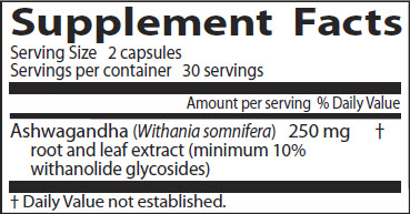 Съставки: Екстракт от корен и листа на ашваганда, минимум 10% витанолидни гликозиди, модифицирана целулоза, магнезиев стеарат с растителен произход