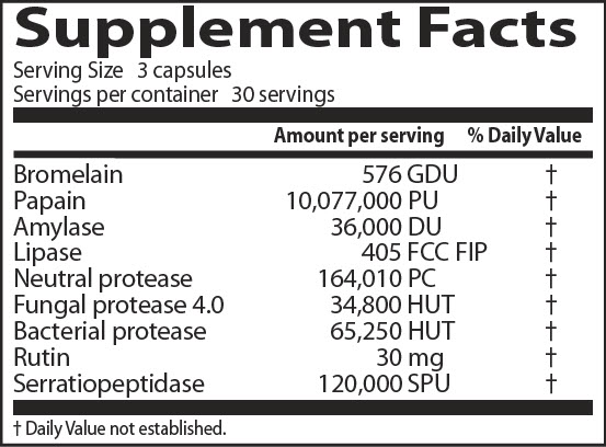 Съставки: Бромелаин, папаин, амилаза, липаза, неутрална проетаза, протеаза с произход от гъбични организми, бактериална протеаза, рутин, сератиопептидаза, модифицирана целулоза