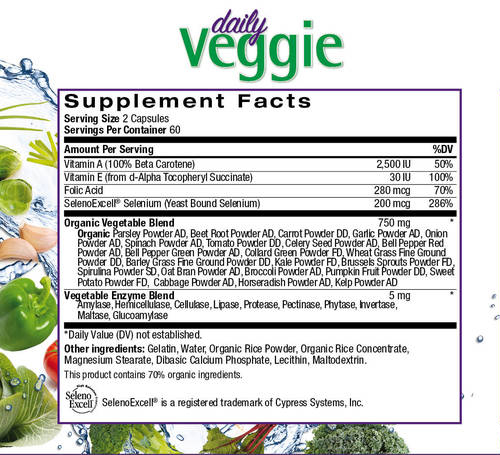JuiceFestiv Daily Veggie е обогатена с патентована бленда ензими, които способстват за обмяната на веществата. Суплементът съдържа чиста форма на селен, който има антиоксидантно действие и благоприятства нормалното протичане на редица метаболитни процеси.
