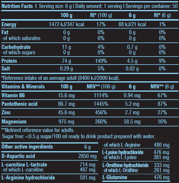 Съставки: витамин В6, магнезий, цинк, л-карнитин л-тартрат, л-аргинин, л-орнитин, л-глутамин, D-Aspartic Acid