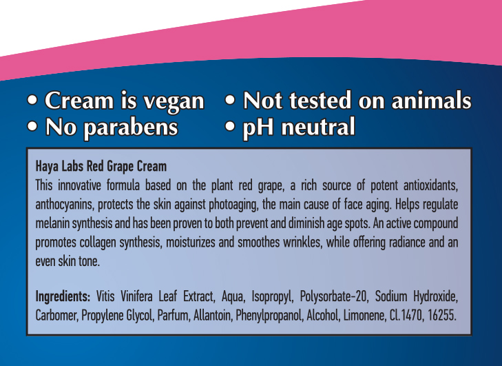 Haya Labs - Red Grape Cream съдържа иновативна формула, която е изцяло на растителна основа - активната съставка е червено грозде.