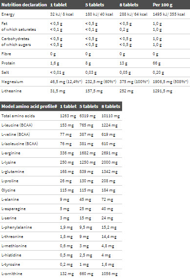 Съставки: магнезий, л-орнитин, л-лизин, л-аргинин хидрохлорид, л-валин, л-изолевцин, л-аргинин алфа кетоглутарат