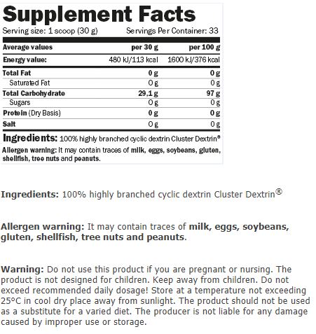Съставки: 100% highly branched cyclic dextrin Cluster Dextrin