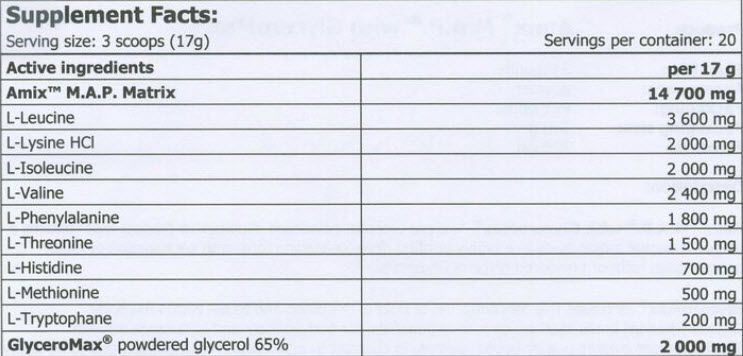 Amix ™ M.A.P.® с GlyceroMax® е продукт, който съдържа уникални есенциални аминокиселини в високопречистена, свободна кристална форма с комбинация от силно концентрирана форма на глицерол GlyceroMax®.