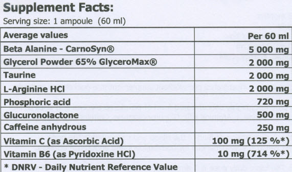Съставки: таурин, бета-аланин, л-аргинин, кофеин, витамин С, витамин В6