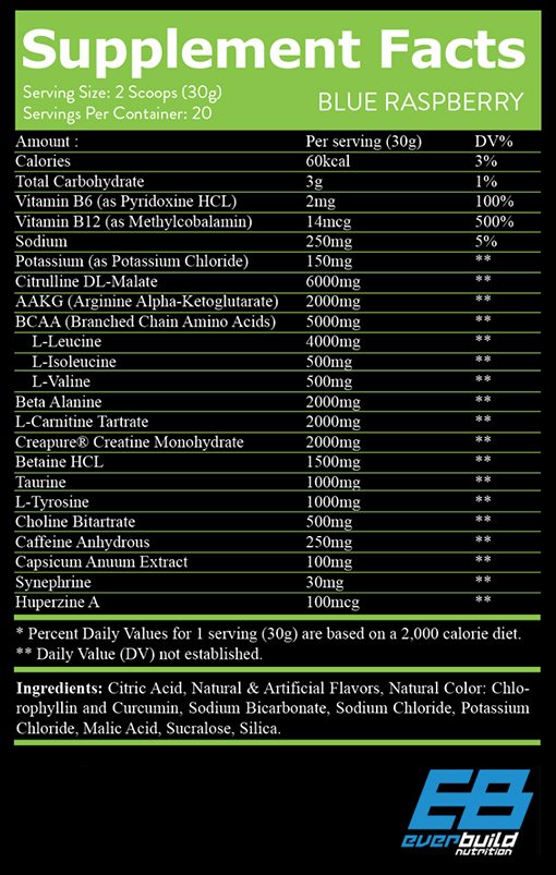 EVERBUILD има добавени към състава си натрий и калий – важни електролити, които благоприятстват оптималната хидратация по време на тренировка и повишават нивата на енергия. Формулата на продукта е обогатена с L-карнитин, който спомага за загубата на тегло като транспортира мастните киселини до митохондриите на клетките и чист екстракт от червен пипер, който повишава телесната температура и има силен противовъзпалителен ефект. Витамини В6 и В12 също редуцират умората и спомагат за оптимална концентрация. Суплементът съдържа Creapure
