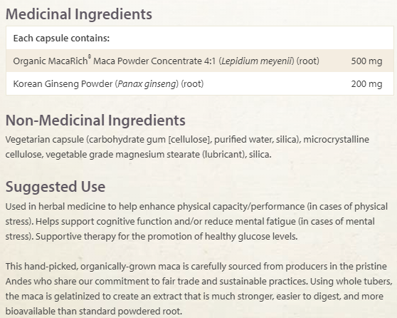 Съставки: Органичен MacaRich® прахообразен концентрат, Корейски женшен прах