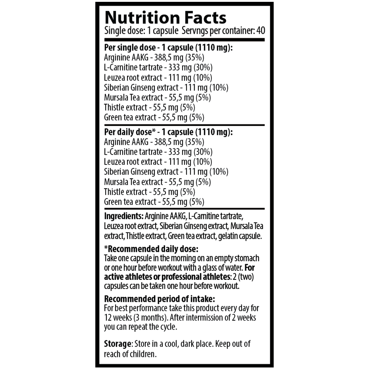 Съставки: Аргинин AAKG, Л-Карнитин тартрат, Левзея корен екстракт, Сибирски Женшен екстракт, Сибирски Женшен екстракт, Мурсалски чай екстракт, Магарешки бодил екстракт, Зелен чай екстракт, Желатинова капсула.