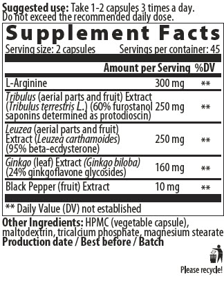 Съставки: Tribulus terrestris , Leuzea carthamoides ,Gingko biloba , L- Arginine , Екстракт от черен пипер.