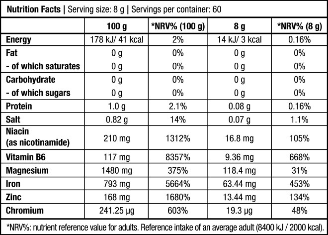 CreaFlash Creatine Complex 56% (CreaArg HCl, буфериран микронизиран креатин, креатин цитрат), CreaFlash Matrix [Energy Recycling Blend (калциев цитрат малат, L-аргинин алфа-кетоглутарат, магнезиев цитрат, железен (III) фумарат, ниацин), ATP Energy Blend (аденозин монофосфат, рибоза, желязо пирофосфат, пиридоксин хидрохлорид), метаболитен смес (алфа липоева киселина, цинков оксид, хромен хлорид хексахидрат)], киселина (лимонена киселина), ароматизанти, пълнител (карбоксиметил целулоза), сол, подсладител (сукралоза), цветове (тартразин, Понсо 4R)