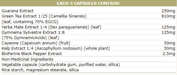 Съставки: екстракти от гуарана, зелен чай, йерба мате, лют червен пипер, gymnema sylvestre extract