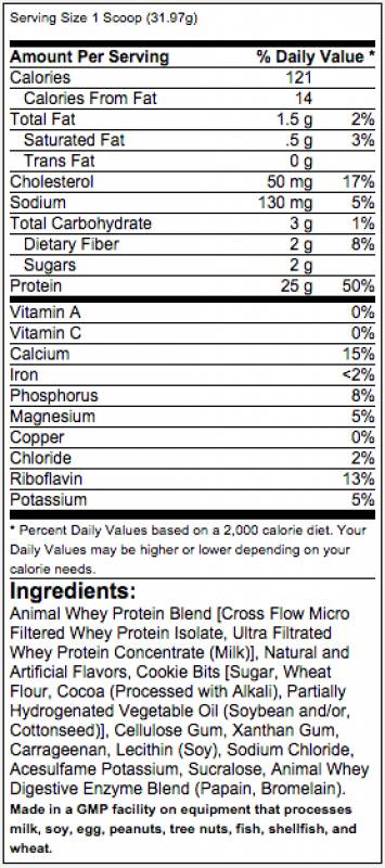 Съставки: Animal Whey Protein Blend [Cross Flow Micro Filtered Whey Protein Isolate, Ultra Filtrated Whey Protein Concentrate (Milk)], Cocoa (Processed with Alkali), Natural and Artificial Flavors, Cellulose Gum, Xanthan Gum, Carrageenan, Lecithin (Soy), Sodium Chloride, Acesulfame Potassium, Sucralose, Animal Whey Digestive Enzyme Blend (Papain, Bromelain).