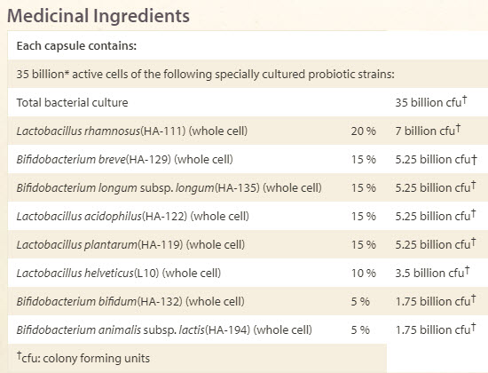 Формулата съдържа лактобацили за подпомагане на тънките черва, както и бифидобактерии за дебелото черво, лактобацилус рамносус за подсилване на имунната система и лактобацилус ацидофилус за намаляване ефекта на гъбичните инфекции, свързани с приема на антибиотици.