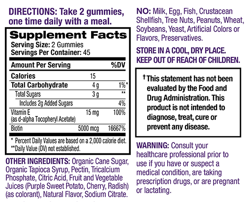 Natrol за коса, кожа и нокти Gummies доставя 5000 мкг биотин в само две желенца, което ги прави едни от най-хранителните витамини за коса, кожа и нокти на разположение. Освен това, Gummies за коса, кожа и нокти са 90% органични, направени от органични подсладители, без ГМО и не съдържат изкуствени вкусове, подсладители, оцветители и консерванти.