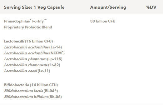 Съставки: Лактобацили(16 млрд. CFU) - Lactobacillus acidophilus (La-14), Lactobacillus acidophilus (NCFM®) , Lactobacillus plantarum (Lp-115), Lactobacillus rhamnosus (Lr-32), Lactobacillus casei (Lc-11), Бифидобактерии (14 млрд. CFU) - Bifidobacterium lactis (BI-04®) , Bifidobacterium bifidum (Bb-06)