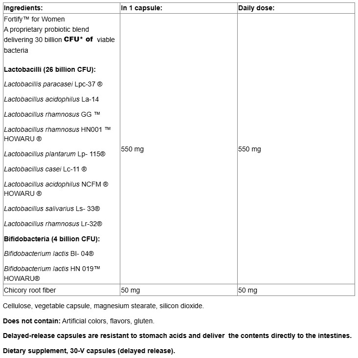 Съставки: Лактобацили (24 млрд. CFU) - Lactobacillus acidophilus (La-14), Lactobacillus plantarum (Lp-115), Lactobacillus acidophilus (NCFM®), Lactobacillus gasseri (Lg-36), Lactobacillus rhamnosus (Lc-11), Бифидобактерии(6 мрлд.CFU) - Bifidobacterium lactis (BI-04®)