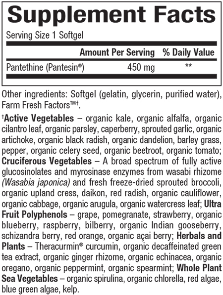 Пантетин (Витамин B5) на Natural Factors е иновативна формула, която осигурява 450 mg биоактивна коензимна форма на витамин B5, в комбинация с Farm Fresh Factors ™, биоенергична смес от фитонутриенти, за директна подкрепа на липидния метаболизъм и за понижаване на общото ниво и нивата на LDL холестерола.
