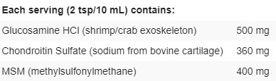 Съставки: глюкозамин сулфат (като калиев хлорид от черупчести /скарида, ракообразен екзоскелет/), МСМ (Метилсулфонилметан), Хондроитин сулфат (натрий от говежди хрущял)