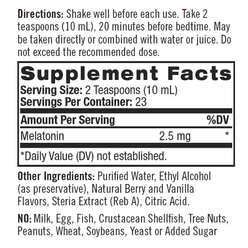 Начин на употреба: Разклатете, преди да използвате Melatonin 2.5 mg Liquid. Преди лягане взимайте по 1 доза, но не превишавайте дозата.