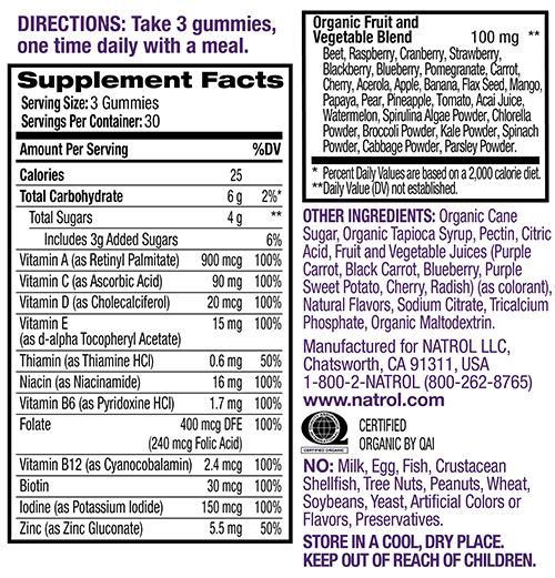 Natrol Men's Multi Gummies снабдяват тялото ви с полезни вещества от специално подбрани плодове и зеленчуци. Освен това, те са създадени с 85% органични съставки. Не съдържат ГМО, желатин, изкуствени аромати, подсладители, оцветители и консерванти. Специално предназначени са за вегетарианци, защото са произведени на базата на пектин. По тази причина продуктът не полепва по зъбите и опаковката.