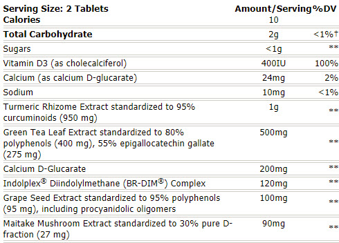 Съставки: витамин D3, калций, калций д-глюкарат, куркумин ризом екстракт, екстракт от зелен чай, екстракт от гроздово семе
