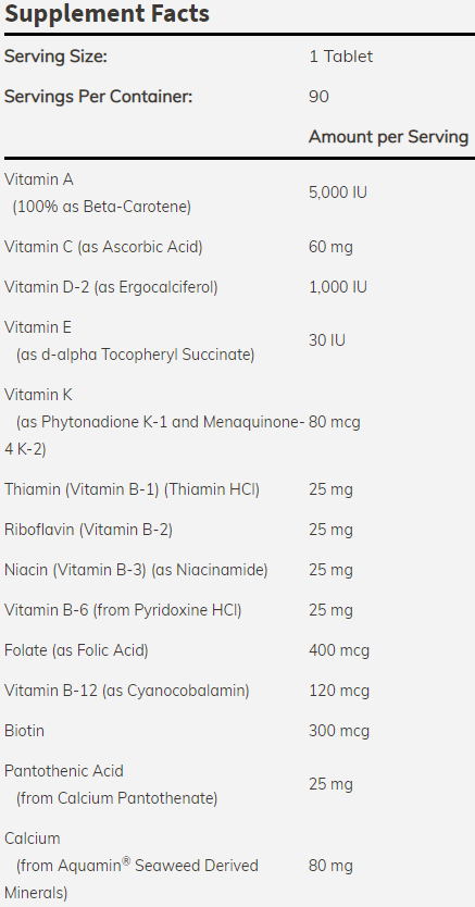 Съставки: витамин А, витамин С, витамин Е, витамин К, витами В6, витамин В12, калций, магнезий, фолат, тиаминм рибофлавин, ниацин, биотин